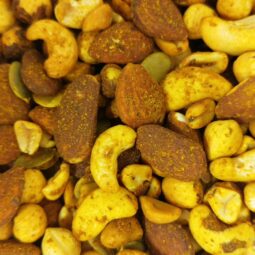 Arachides*, noix de cajou*, amandes*, noisettes*, graines de courge*, farine de pois chiche*, épices* poudre 1% : tomate*, paprika*, piment de Cayenne*, coriandre*, cumin*, citron*, fenugrec*, oignon*, sel, macis*, ail*, curcuma*, gingembre*, piment doux d’Espagne*, girofle*, cannelle*, laurier*.